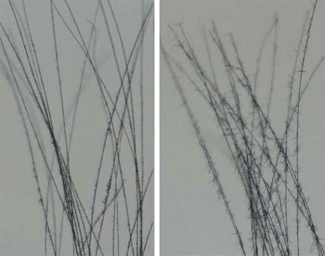 Contrast between THK Hair Building Fibres and another leading brand. Note THK Hair fibres are longer and dont clump together: